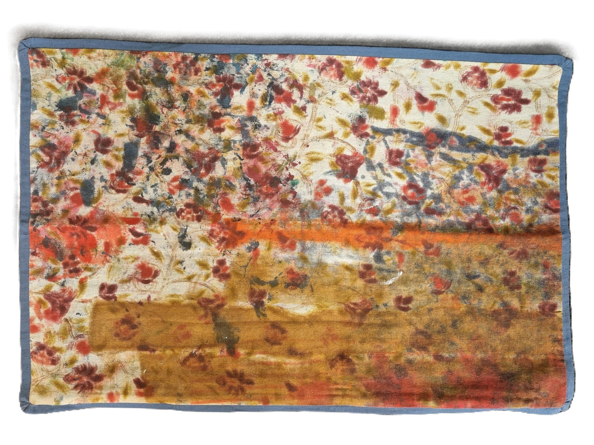 Measuring 60 x 40 cm, each cushion cover is a true original—its front panel crafted from 100% cotton, layered with the rich textures and tonal depth that only years of traditional printmaking can create. The back is made from a soft 45% cotton, 55% linen blend, dyed Azo-free in Blue Iris—a deep, denim hue that adds a moody elegance and brings out the artistry of the piece.