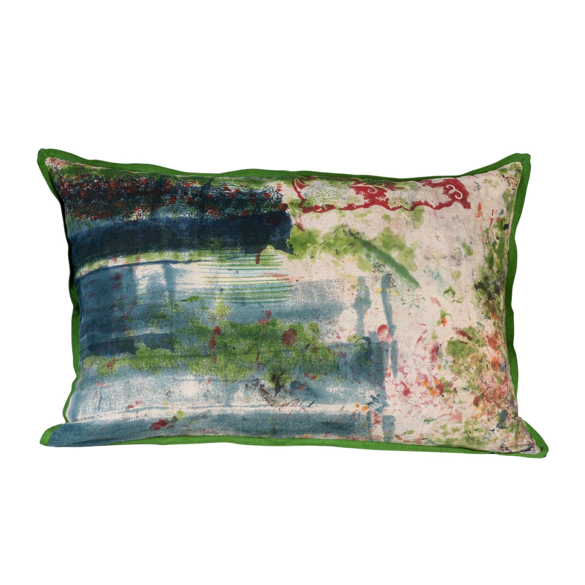 The back is crafted from a soft 45% cotton and 55% linen blend, Azo-free dyed in a deep Moss Green that frames the design with a refined 1 cm flat flange visible on the front.
